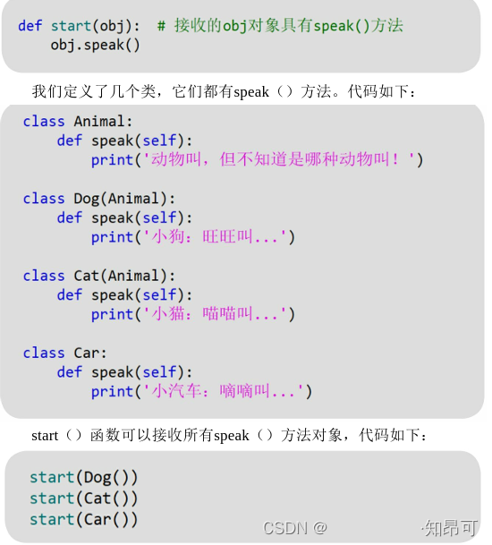 由于支持鸭子类型测试,所以Python解释器不检查发生多态的对象 是否继承了同一个父类,只要它们有相同的行为(方法),它们之间就 是多态的。 例如,我们设计一个函数start(),它接收具有“叫”speak()方法 的对象,代码如下: