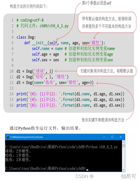 类中的__init__()方法是一个非常特殊的方法,用来创建和初始 化实例变量,这种方法就是“构造方法”。在定义__init__()方法时, 它的第1个参数应该是self,之后的参数用来初始化实例变量。调用构造 方法时不需要传入self参数。