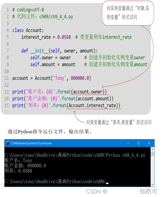 例如,有一个Account(银行账户)类,它有三个成员变量:amoun t(账户金额)、interest_rate (利率)和owner(账户名)。amount和ow ner对于每一个账户都是不同的,而interest_rate对于所有账户都是相同 的。amount和owners是实例变量,interest_rate是所有账户实例共享的变 量,它属于类,被称为“类变量”。 类变量的示例代码如下: