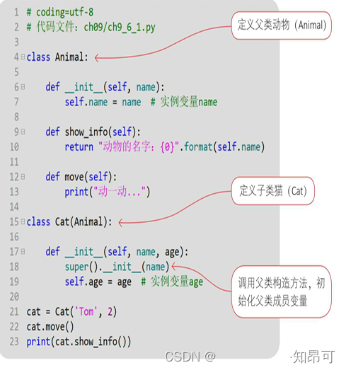 在Python中声明子类继承父类,语法很简单,定义类时在类的后面 使用一对小括号指定它的父类就可以了。 下面是动物类继承图。