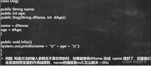 // public Dog(String dName, int dAge){//构造器