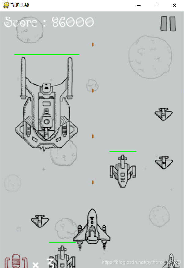 另外还对游戏做了一些改进,比如为中飞机和大飞机增加了血槽的显示,这样玩家可以直观地知道敌机快被消灭了没有;我方有三次机会,每次被敌人消灭,新诞生的飞机会有3秒钟的安全期;游戏结束后会显示历史最高分数。