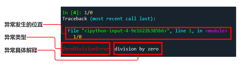 拿1/0为例,我们知道0是无法作为除数的,这里就存在逻辑错误。在错误信息中,我们发现这是一个ZeroDivisionError异常类型,其发生异常的是代码第1行1/0位置,具体解释是division by zero(除数为0)。