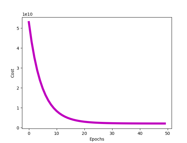 gradient_descent 函数返回 theta 和 J_all。theta 显然是参数向量,其中包含假设的θs 值,J_all 是一个列表,包含每个 epoch 后的代价函数。J_all 变量并非必不可少,但它有助于更好地分析模型。