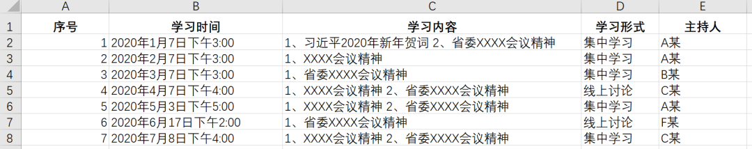 现在需要将每份会议文档中的 学习时间、学习内容、学习形式、主持人 四项关键信息提取出来,整理到 Excel 表格中: