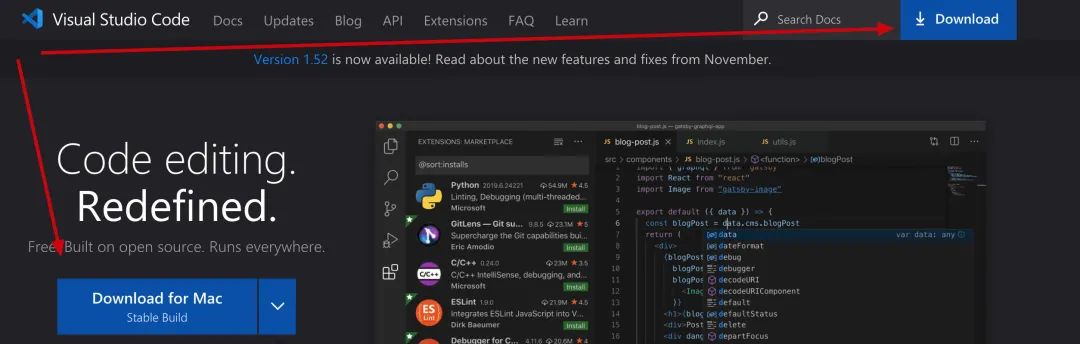 关于 VS Code 安装,在微软官方网站:https://code.visualstudio.com/ 提供免费下载,VS Code 支持 Windows , Linux , Mac OS 三种操作系统,建议去官方下载,不要在第三方软件下载网站下载,第三方软件下载站的猫腻太多了。