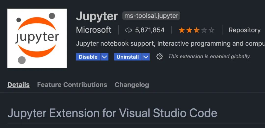 众所周知,python 代码,除了通常使用的 .py 文件外,对于数据科学而言, Jupyter Notebook 也是大家的重要选项,因此,VS Code 中也提供了 Jupyter Notebook 的支持插件,在 VS Code 扩展市场中的名称是 Jupyter,如下: