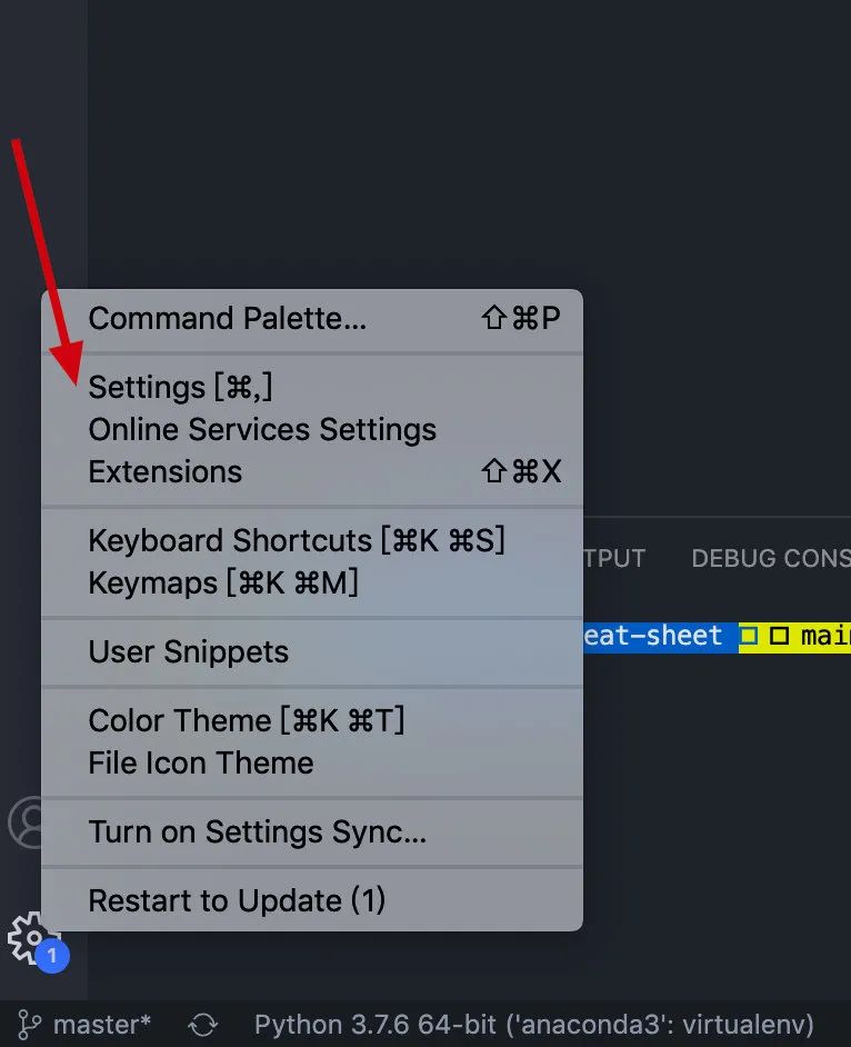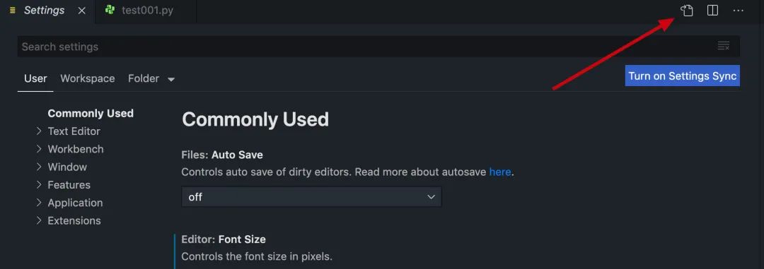 在下面界面的右上角点击箭头所示,转到 settings.json,