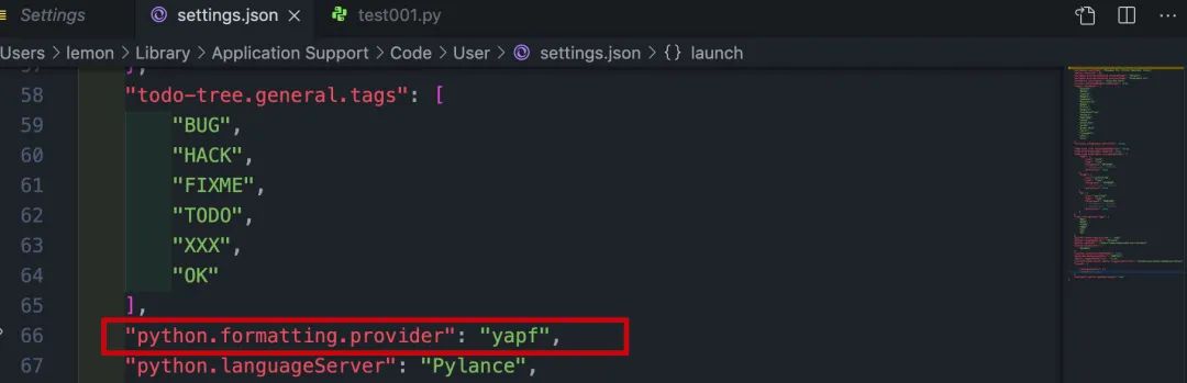 在 settings.json 里进行设置 "python.formatting.provider": "yapf", 图示如下: