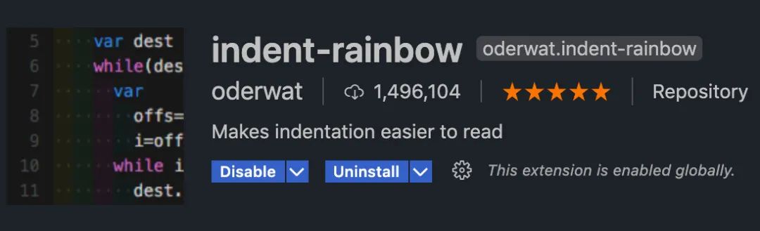 当代码缩进层次较多时,为了视觉上容易识别,一般希望可以多个缩进以不同颜色进行高亮显示, VS Code 中 indent-rainbow 插件可以实现这个功能。