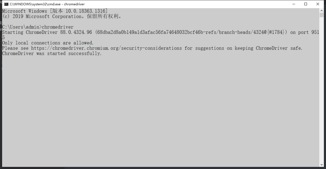 配置完成之后可以在命令行输入chromedriver命令,如果输入之后出现如下图所示的界面,则说明环境变量配置好了。
