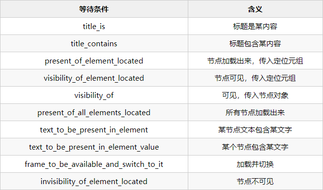 关于等待条件,其实还有很多,比如判断标题内容,判断某个节点是否出现了某文字等。具体如下表所示: