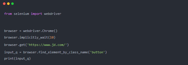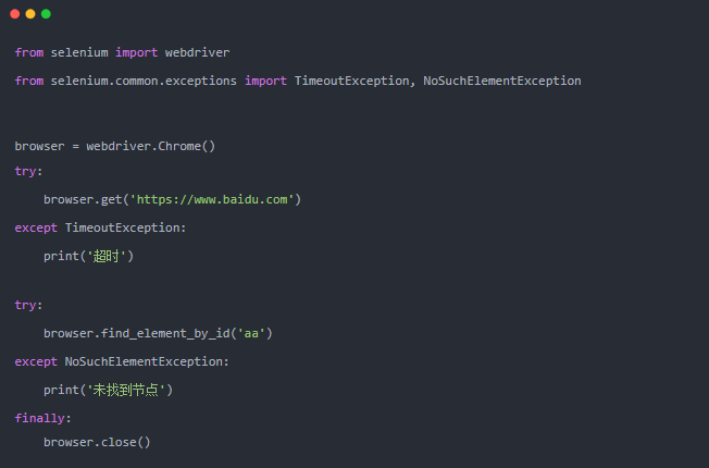 在使用selenium的时候,难免会遇到一些异常,例如超时、节点未找到的错误等等。一旦出现此类错误,程序便无法运行下去了。这里我们可以使用try except语句来捕获异常。