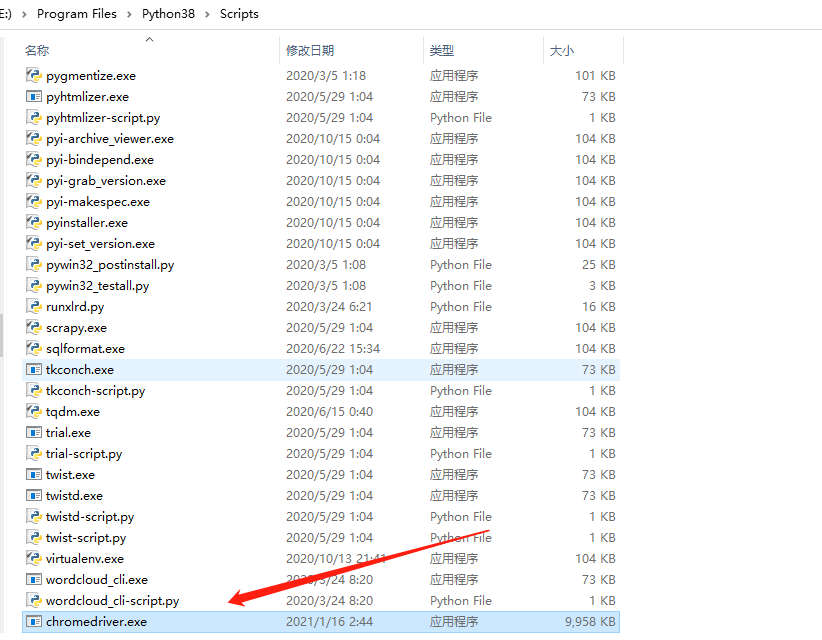 将刚刚下载好的驱动解压出来,并将其放入Python的Scripts目录下即可。如下图所示: