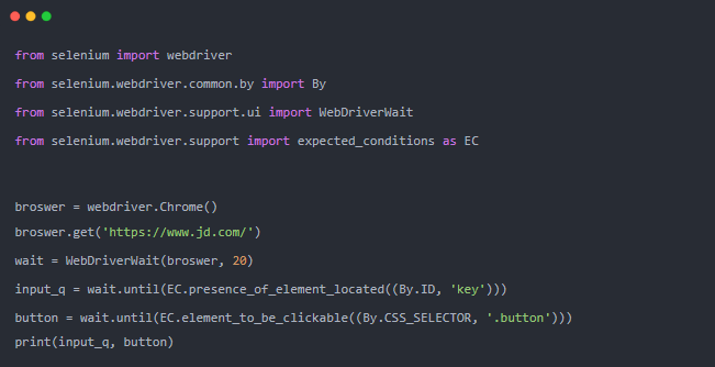 接下来对上面代码进行简单的说明,首先引入WebDriverWait这个对象,并指定最长时间,然后调用它的until()方法,传入要等待的条件expected_conditions,比如这里传入了presence_of_element_located这个条件,代表节点出现的意思,其参数是节点定位的元组,也就是ID为key的搜索框。