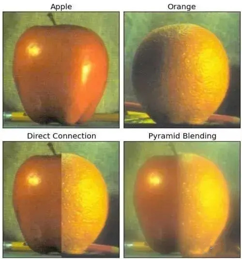 来看一下用例,下图展示的是OpenCV-Python在Image Blending中使用Pyramids创建一个名为’Orapple’的新水果的功能。