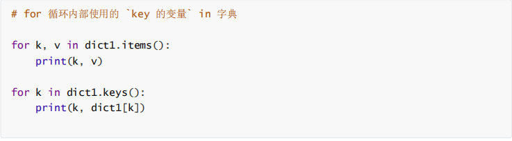 提示:在实际开发中,由于字典中每一个键值对保存数据的类型是不同的,所以针对字典的循环遍历需求并不是很多