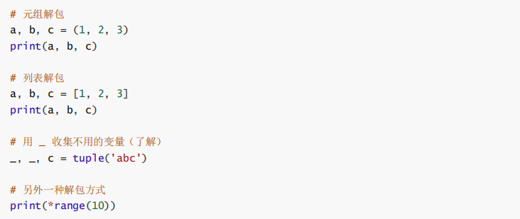 解包在英文里叫做 Unpacking,就是将容器里面的元素释放出来。Python 中的解包是自动完成的,例如: