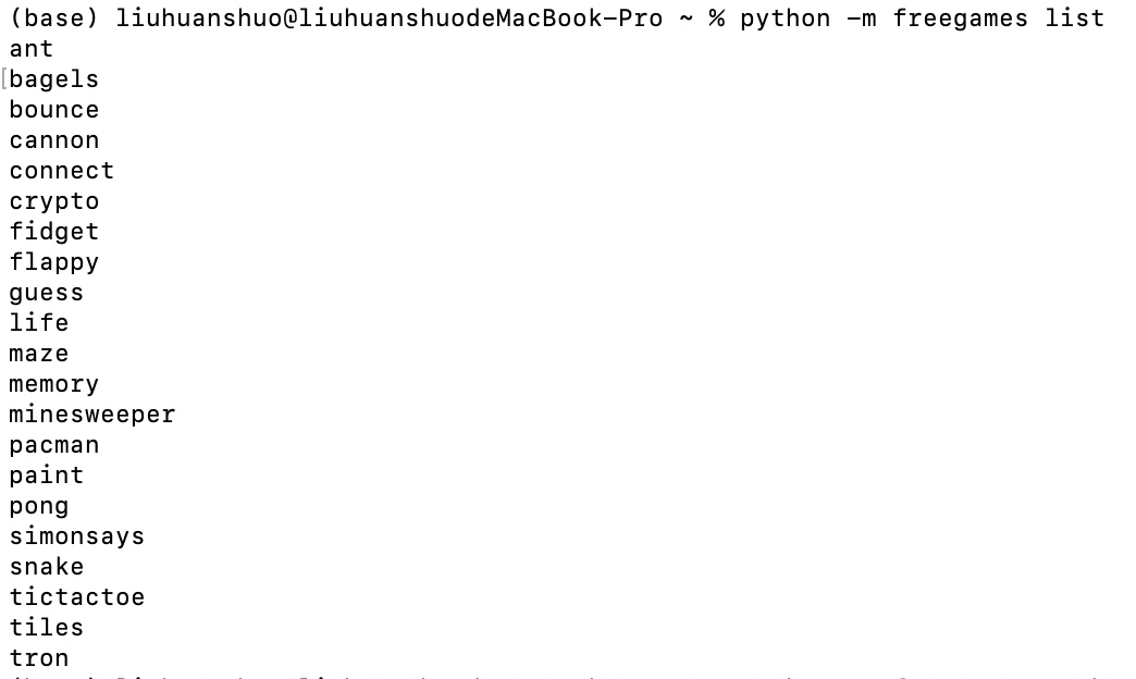 安装完之后我们可以使用python -m freegames list来查看所有的游戏列表