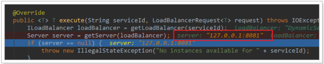 - getServer(loadBalancer):利用内置的负载均衡算法,从服务列表中选择一个。本例中,可以看到获取了8082端口的服务