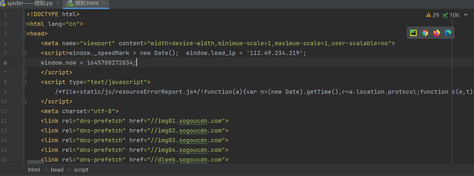 爬取完了之后,作者是存到了自己的文件夹下面,然后打开 搜狗.html ,我们就可以看到网页的源码了。