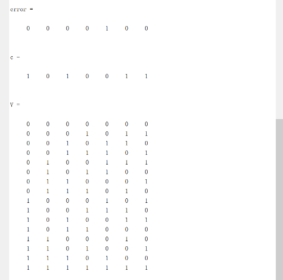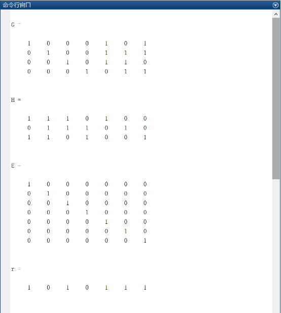 某一(7,4)线性分组码,给定生成矩阵G (并由此推出其校验矩阵H), G=[1 0 0 0 1 0 1 0 1 0 0 1 1 1 0 0 1 0 1 1 0 0 0 0 1 0 1 1]; 错误图案为E(假设全部为只发生一个错误),给定接收端收到r=[1 0 1 0 1 1 1],求出对应的错误e并进行纠错,得到该r对应正确的c,以及整个码组V。