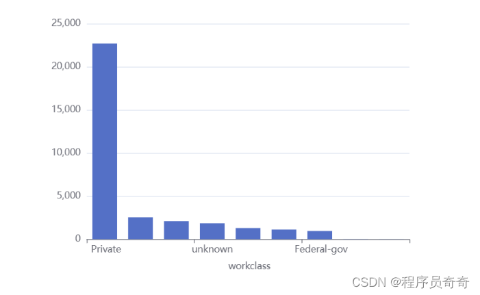 由于个体收入与工作类型有直接影响,所以对工作类型workclass进行可视化分析,统计各工作类型的分布并绘制柱状图,对比各工作的收入占比。