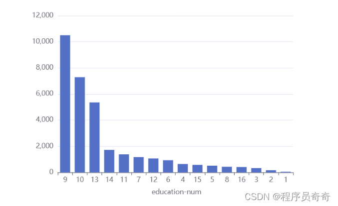对受教育时间education-num绘制柱状图,观察数据分布情况。