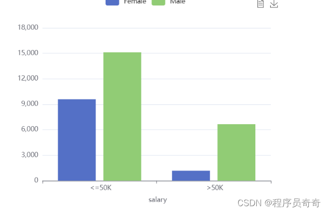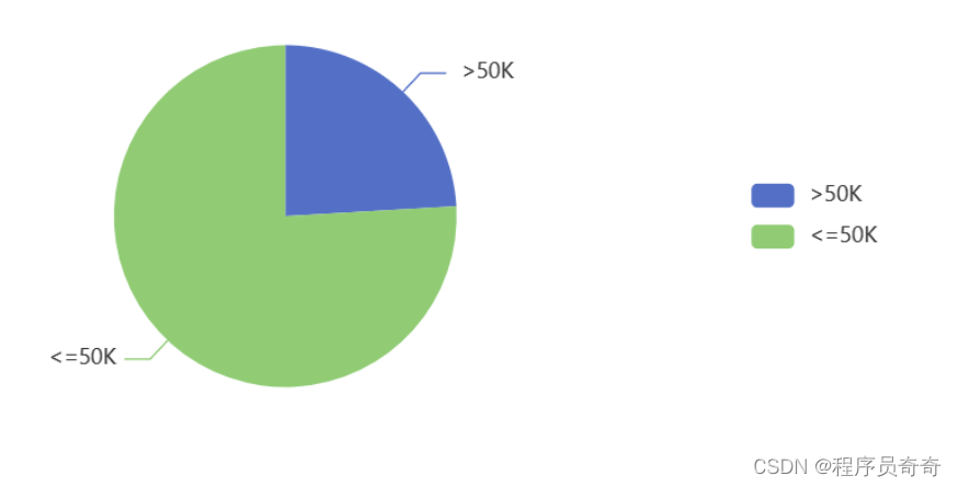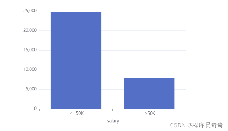 首先,对标签列个体年收入salary进行可视化分析,分别绘制年收入salary分布的饼状图、柱状图直观显示数据的分布情况,便于后续建模。