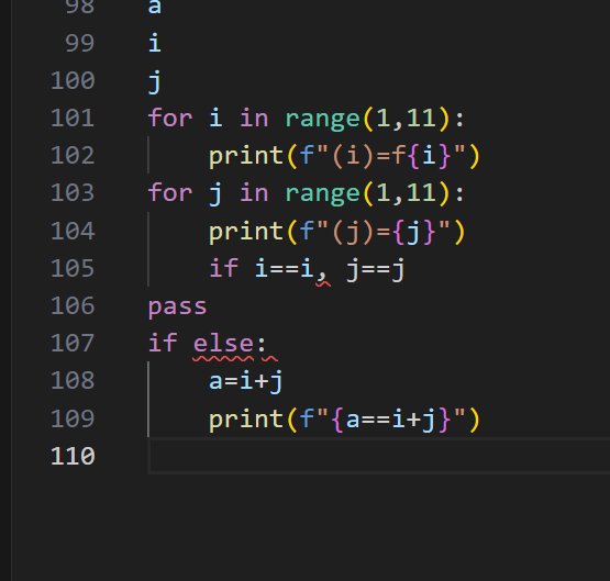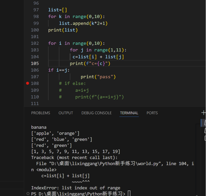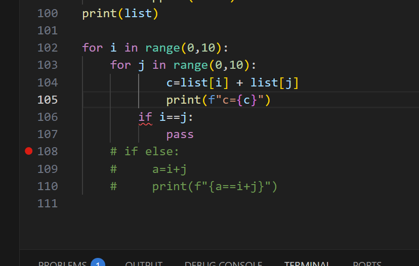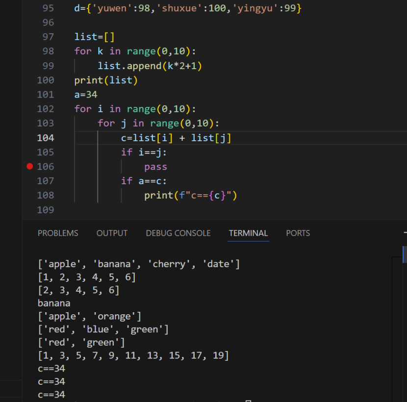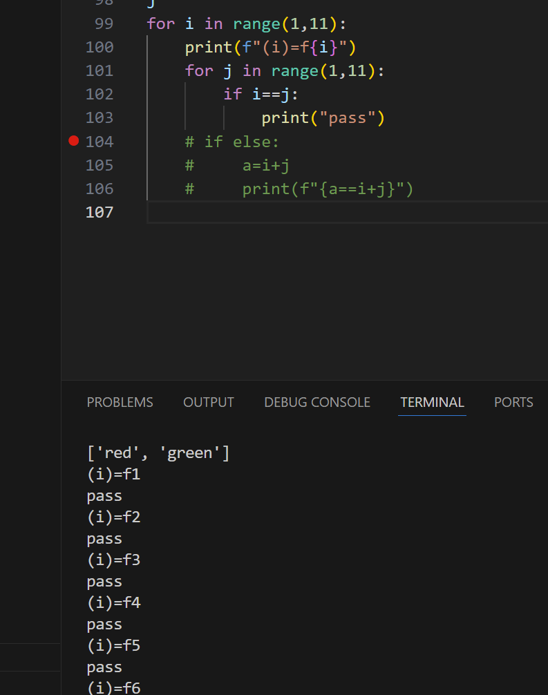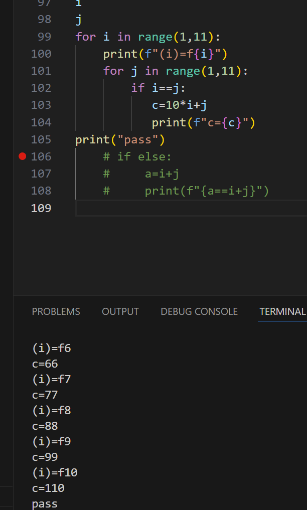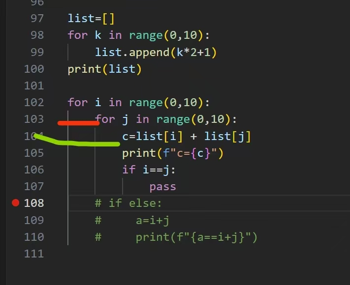 106行应该在循环里面,107行print(“pass”)