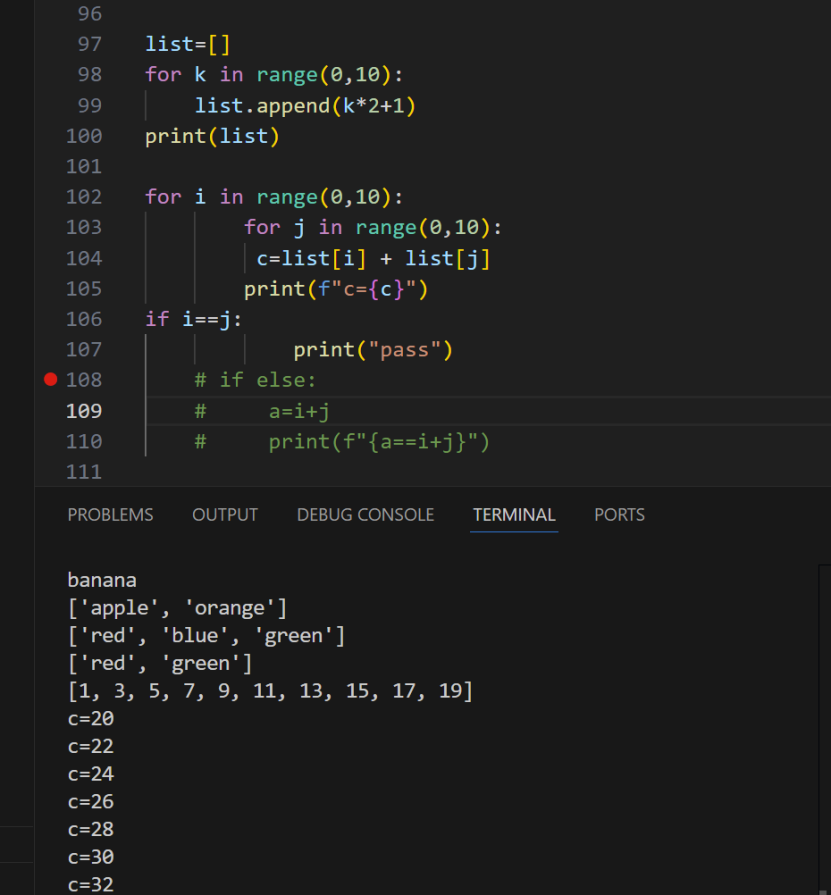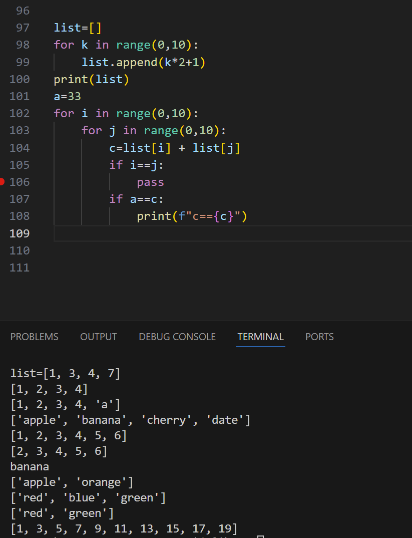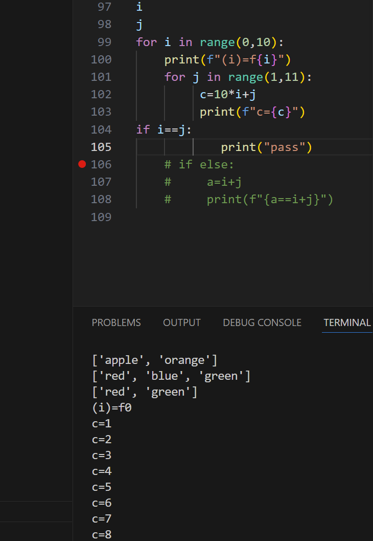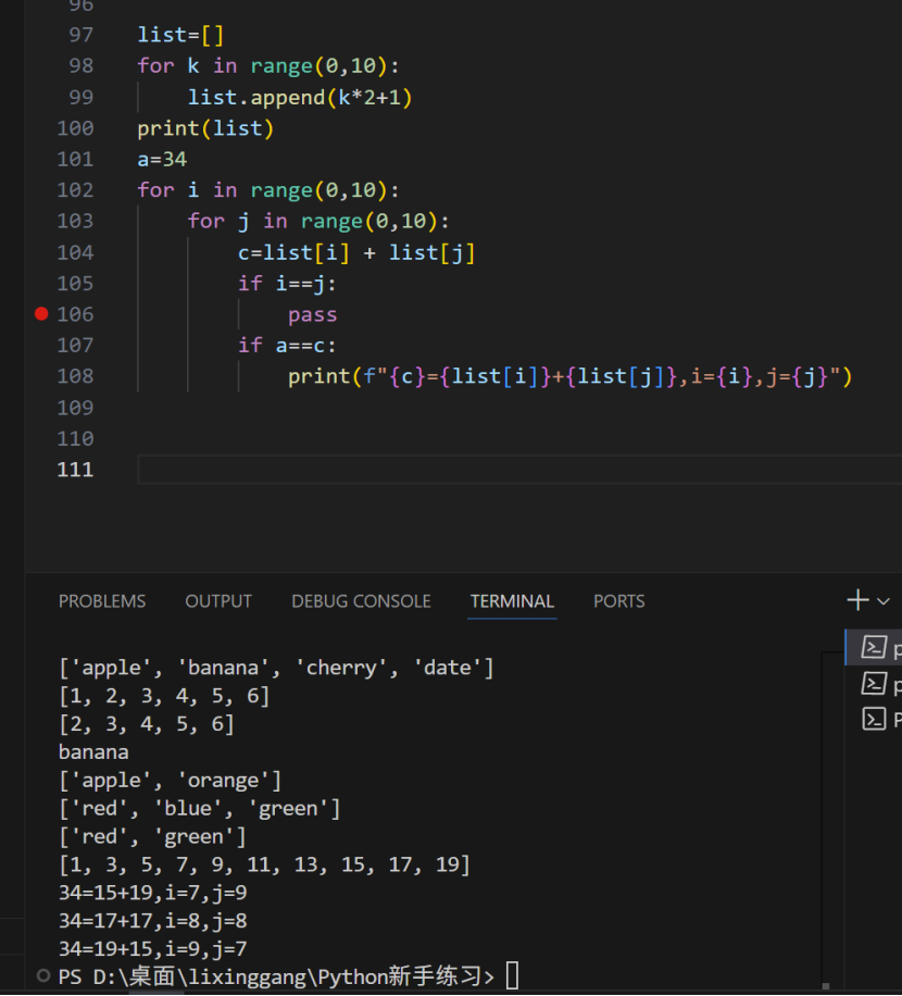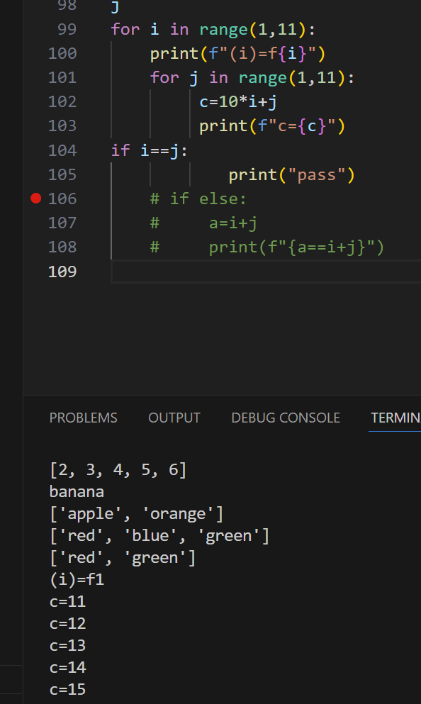106行应该在循环里面,107行print(“pass”)