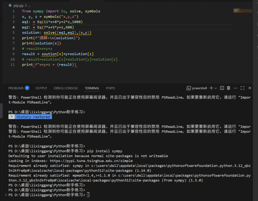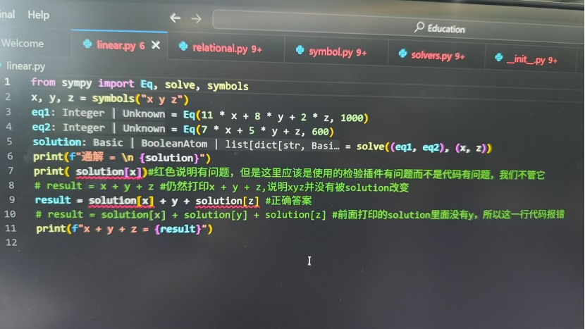 嗯原因很简单,因为我最初也是像你那样以为在参数字符串里面是用逗号分割的,但是这样程序执行不正确,检查了好几遍确定我这里没有问题之后,我就问了deepseek,怎么解线性方程组啊?它不仅告诉我怎么解,还会给我实例代码,实例代码中就有symbols函数的正确用法