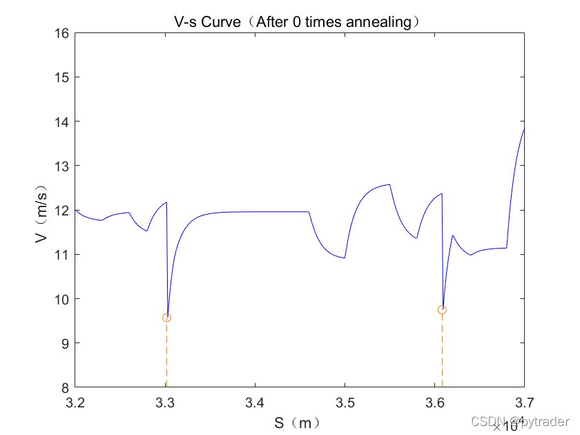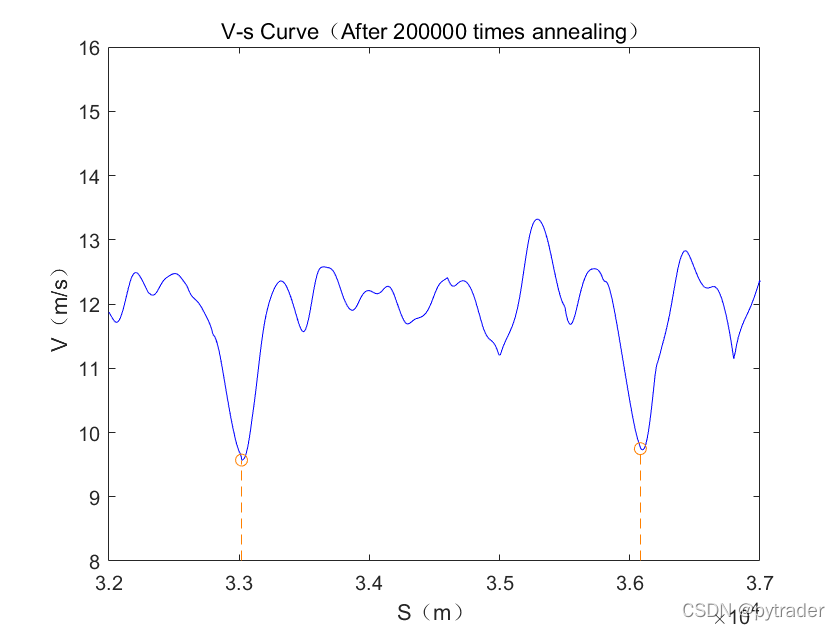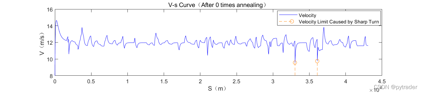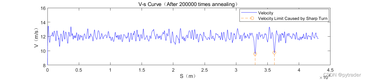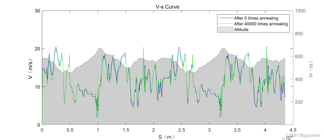 为了研究虚拟骑手到底是在什么地方进行了优化,我们画0次退火和200000次退火的速度曲线: