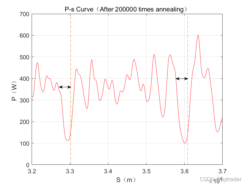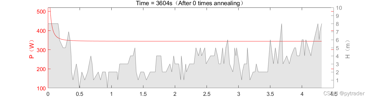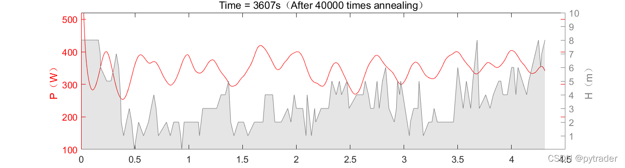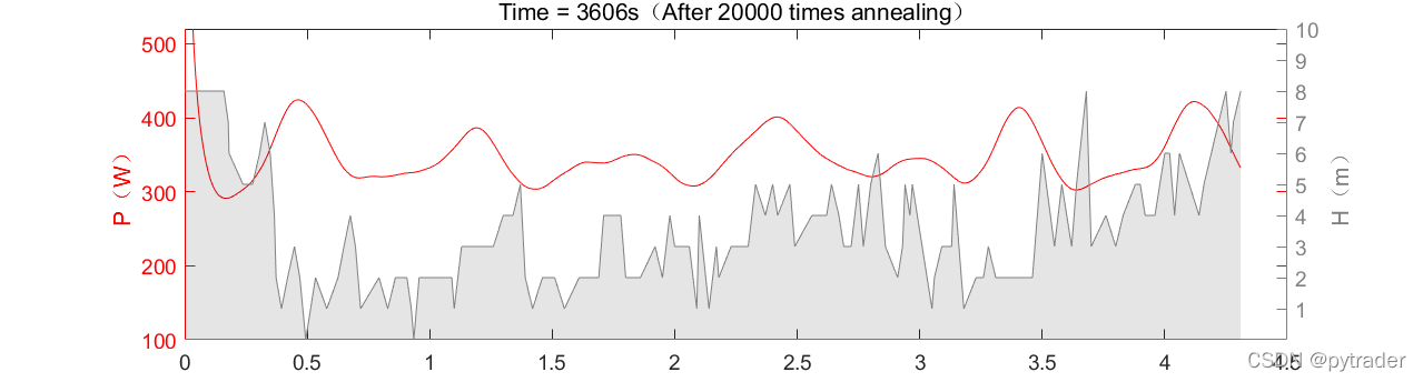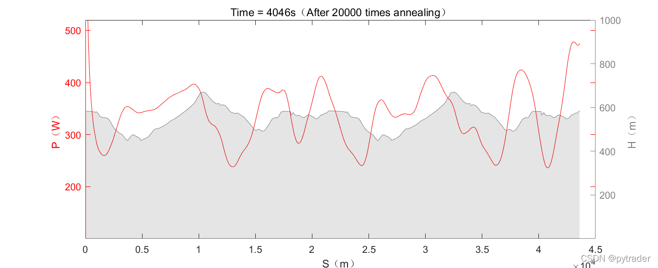 在接下来的20000次退火中,随着退火温度降低,随机化尺度L也跟着下降,意味着虚拟骑手会尝试在更小的尺度上优化功率策略,以适应崎岖不平的地形,最后将完赛时间降到了4046秒。