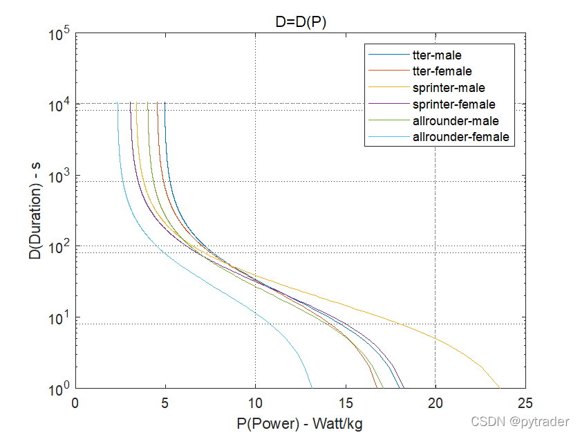 首先思考运动员的功率模型。运动员不可能长时间维持高功率输出,那么运动员的功率输出到底受什么限制呢?题目给出了一种“功率曲线”理论,这种理论指出运动员的功率(Power)与能维持该功率的最长时间(Duration)呈函数关系D=D(P)。