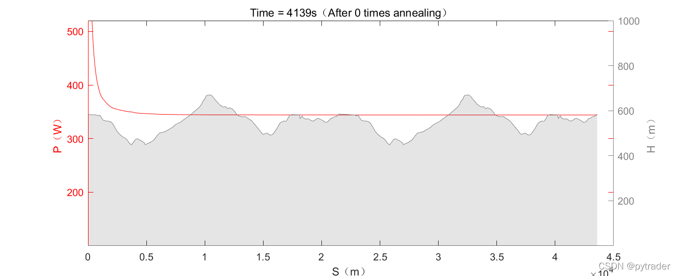 用灰色曲线表示赛道海拔,红色曲线表示功率策略,首先虚拟骑手以初始解为策略完成比赛,用时4139秒。