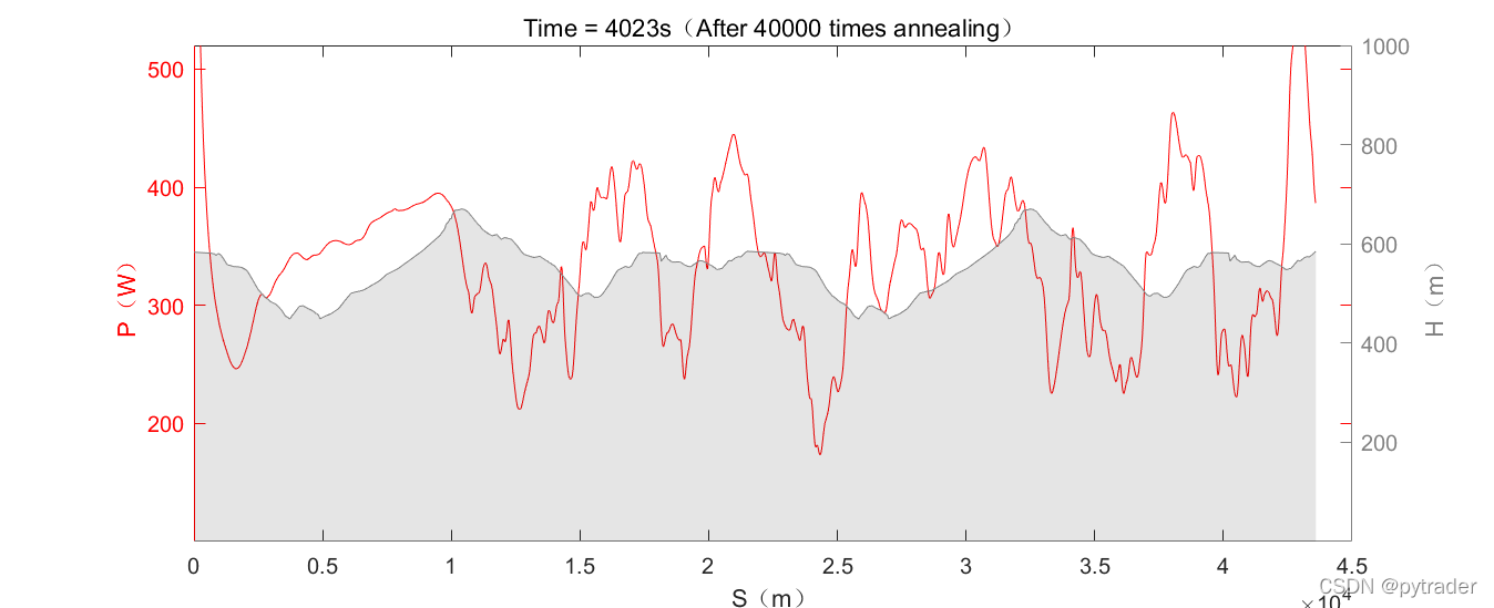 在40000次退火之后,虚拟骑手的功率策略已经达到了非常细致的程度,完赛时间也降到了4023秒。