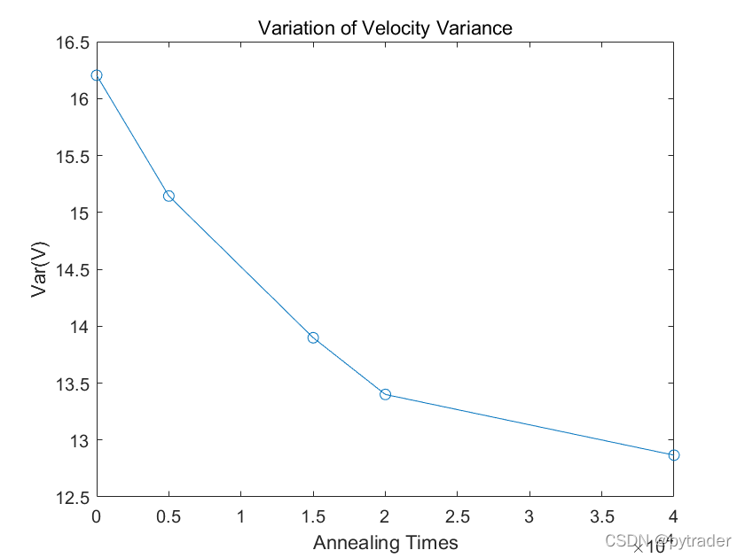 可以发现速度的方差确实随着功率策略的优化而降低,所以骑手在比赛过程中应该尽量保持速度平稳。而且Var(V)和T随退火次数的变化趋势几乎相同,说明在功率曲线的约束下ΔT和Var(V)是有某种确定的正相关关系的,当时我们认为可以通过泛函分析的方法进行研究,可惜时间不允许,故作罢。