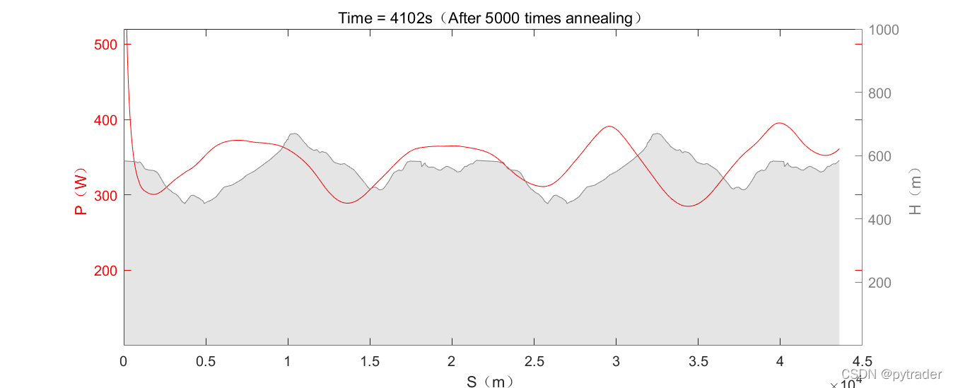 经过5000次模拟退火后,虚拟骑手完赛时间降到了4102秒。可以观察到在这个过程中,骑手尝试从整体上调整功率策略,在上坡时增加功率,下坡时降低功率,最后成功节省完赛时间。