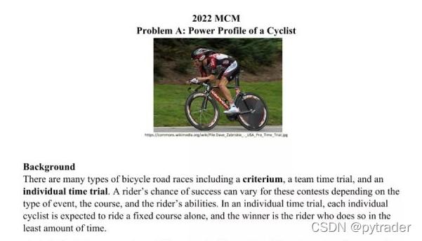 今年美赛A题就是2021年东京奥运会奥地利女博士后Anna Kiesenhofer单枪匹马勇夺女子公路自行车比赛金牌故事的翻版,主题问题就是求解自行车运动员在近40km的赛程中应该如何分配功率以获得更好的成绩。