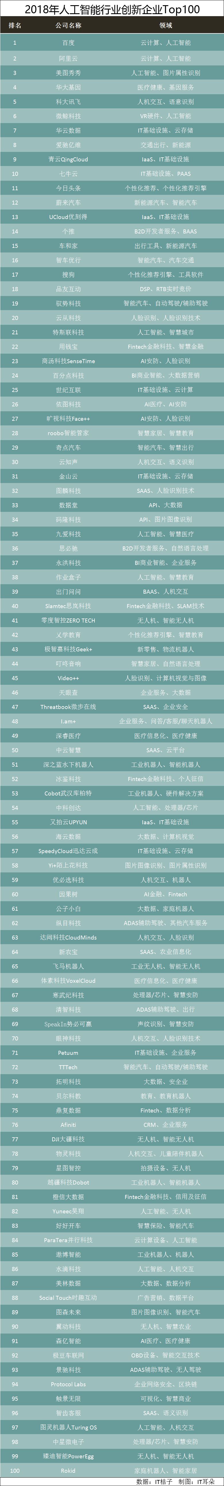 今日,行业领先媒体IT耳朵联合权威数据机构IT桔子共同发布《2018年人工智能行业创新企业Top100》,前十名的企业分别为百度、阿里云、美图秀秀、华大基因、科大讯飞、微鲸科技、华云数据、爱驰亿维、青云、七牛云。
