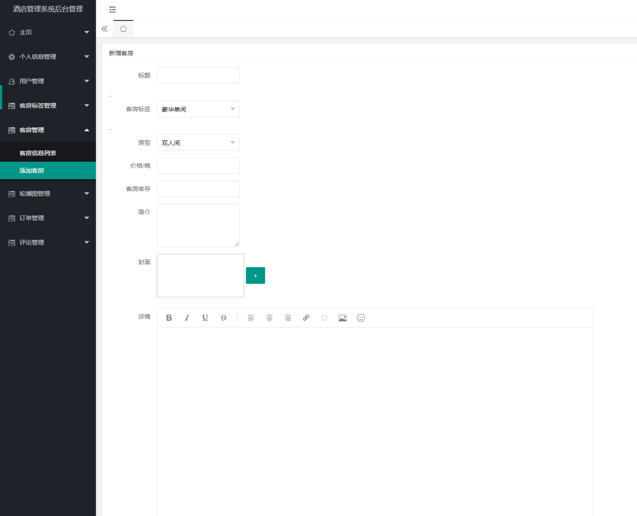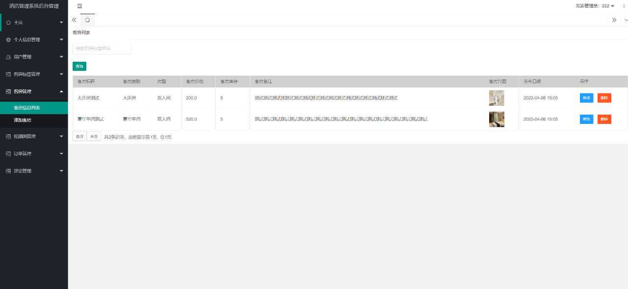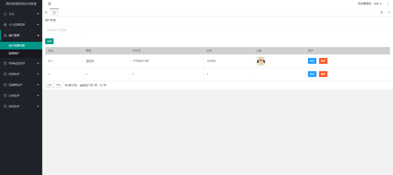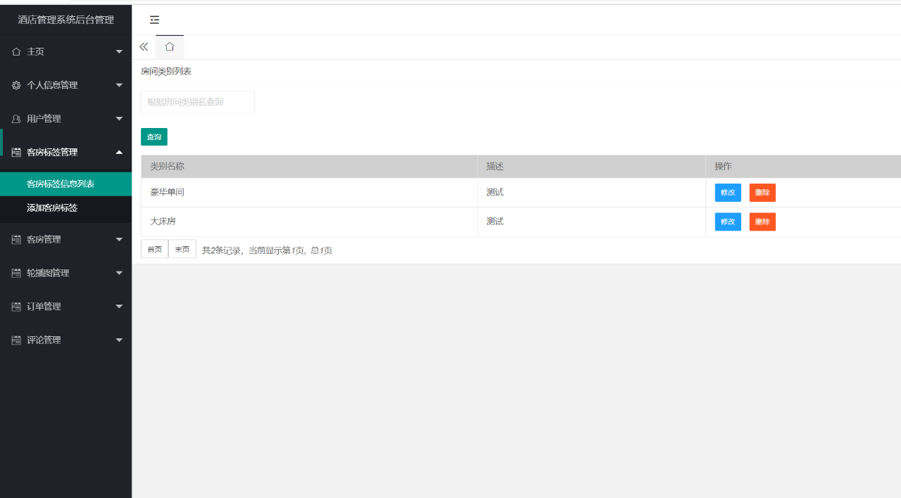 管理员端主要有登录、个人信息管理、用户管理、客房管理、客房标签管理、轮播图管理、评论管理、订单管理。