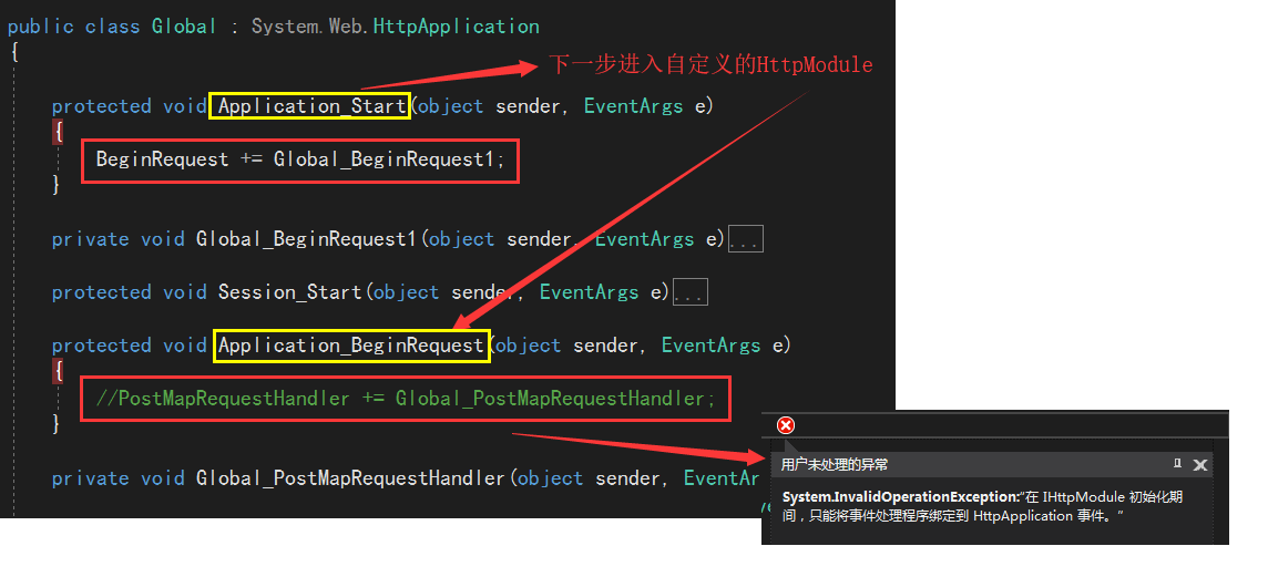 Application_Start-->用户自定义的HttpModule-->Application_BeginRequest (注册->调用)