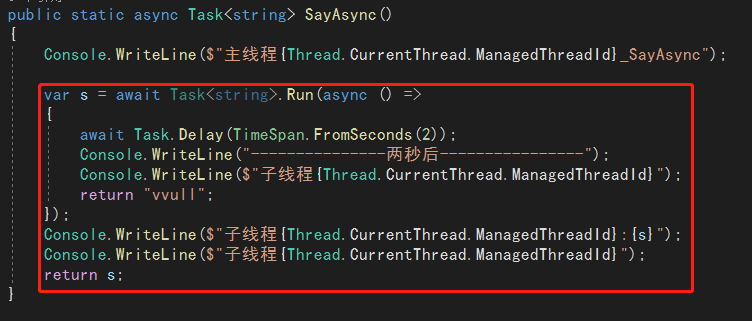 Console.WriteLine($"主线程{Thread.CurrentThread.ManagedThreadId}_SayAsync");