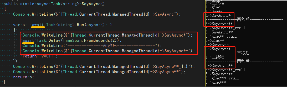 Console.WriteLine($"{Thread.CurrentThread.ManagedThreadId}->SayAsync**_{s}");