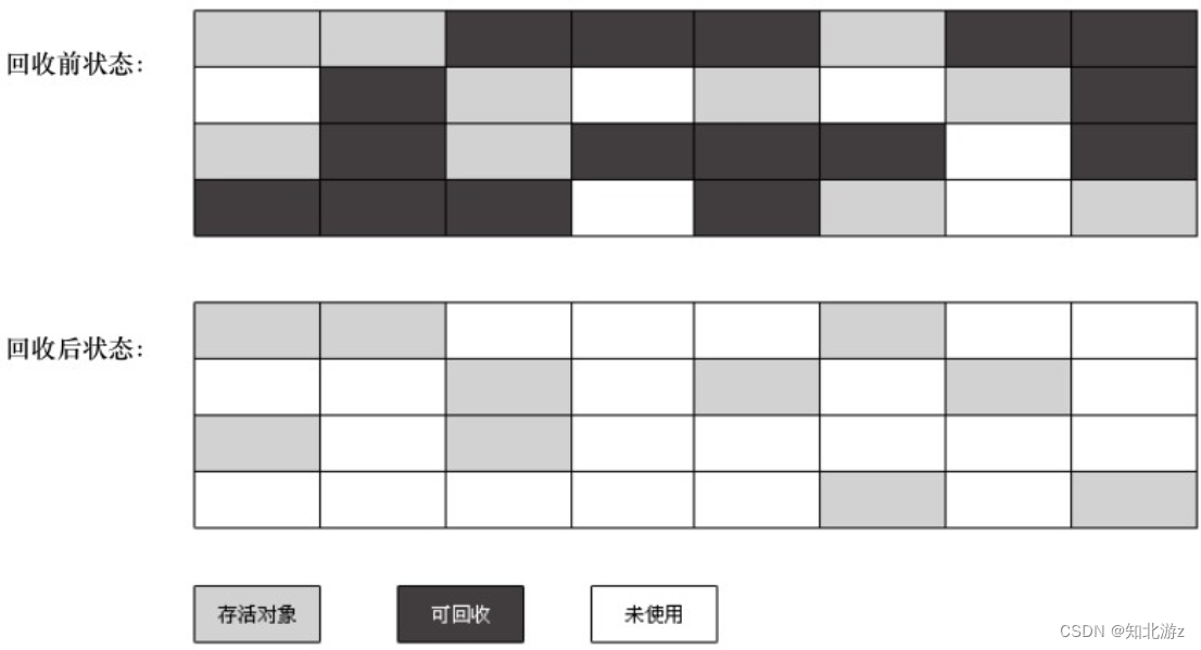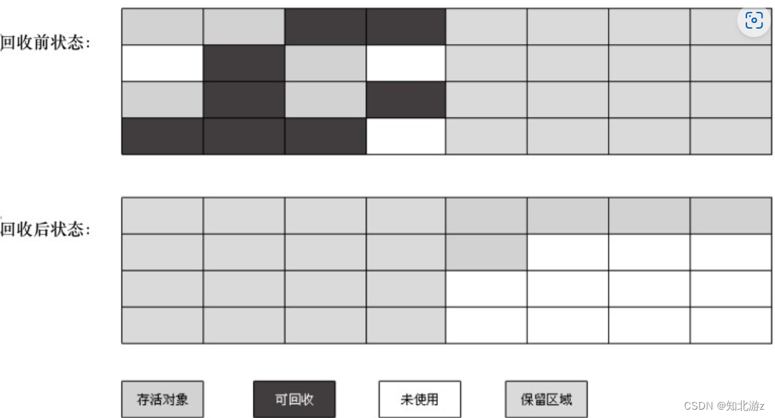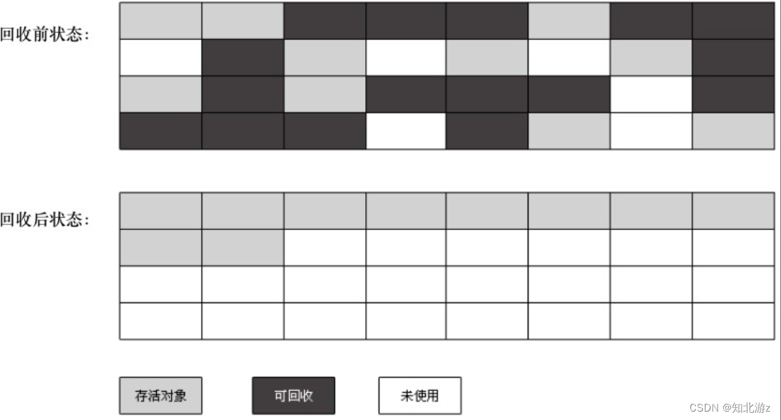 “标记-整理”(Mark-Compact)算法,标记过程仍然与“标记-清除”算法一样,但后续步骤不是直接对可回收对象进行清理,而是让所有存活的对象都向一端移动,然后直接清理掉端边界以外的内存,“标记-整理”算法的示意图如图3-4所示。