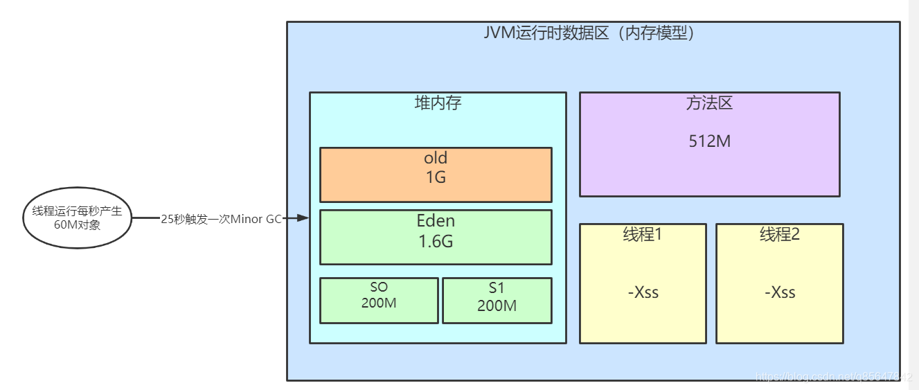 假设以前的GC调优是根据300单/秒来猜测的 假设每秒产生60M对象 Eden区配置 1.6G S0和S1配置了200M 25秒回触发一次MinorGC