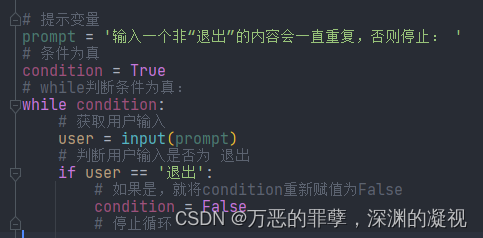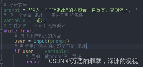 什么意思呢?就是给变量赋值为真(True),将变量作为条件给while判断,因为一直为真,所以能一直循环,但是在循环中添加 if 判断:如果输入的内容为退出,就将外部为真(True)的变量重新赋值改成假(False),以此停止循环: