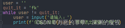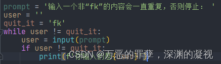 prompt = '输入一个非“fk”的内容会一直重复,否则停止: '
