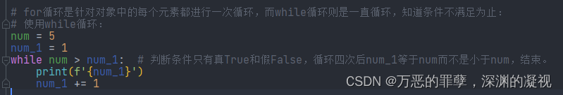 while num > num_1: # 判断条件只有真True和假False,循环四次后num_1等于num而不是小于num,结束。